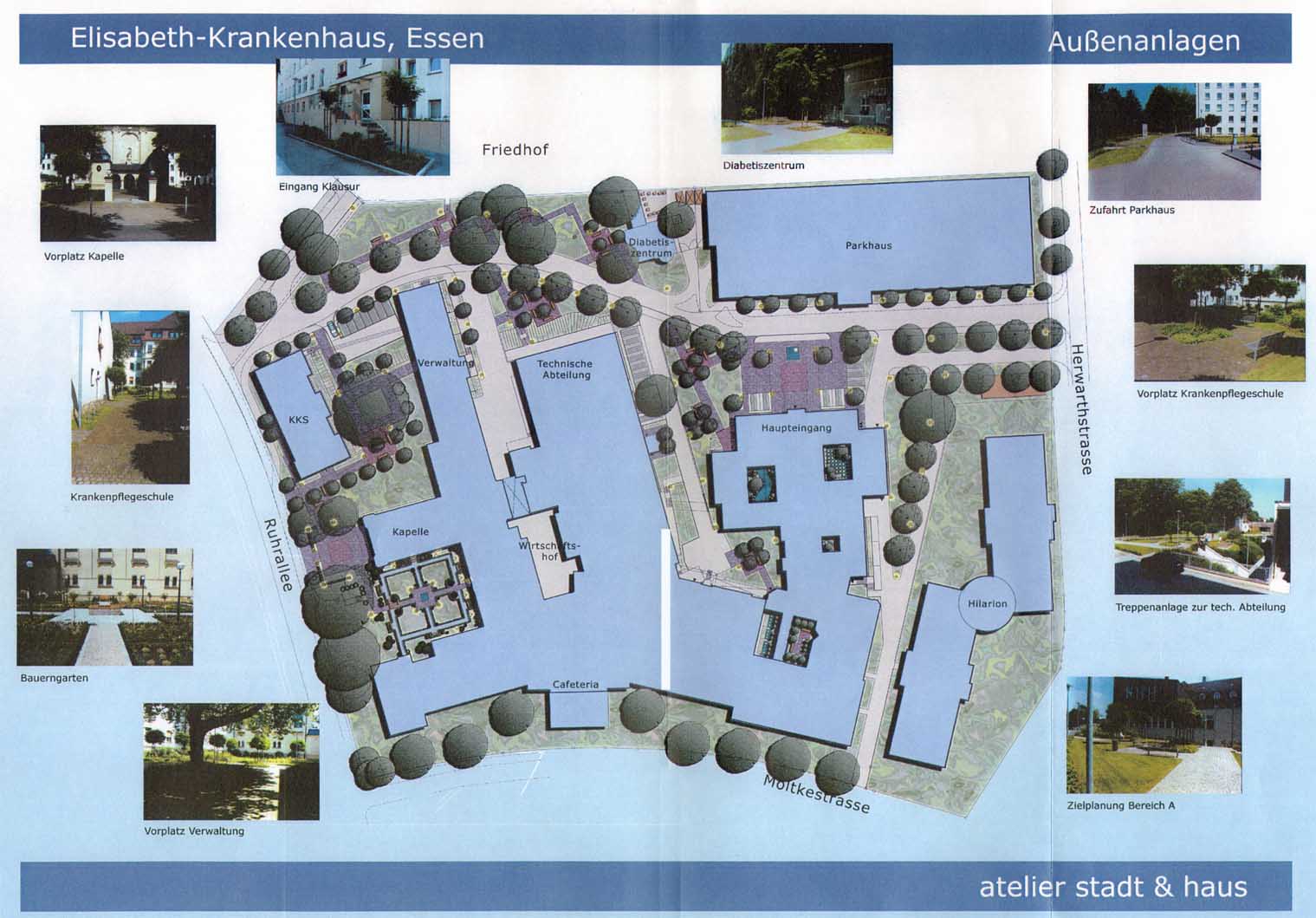 Im Zuge der Modernisierung und baulichen Ergänzung des Elisabeth-Krankenhauses in Essen erfolgte stufenweise auch die Umgestaltung der gesamten Außenanlage auf Basis der